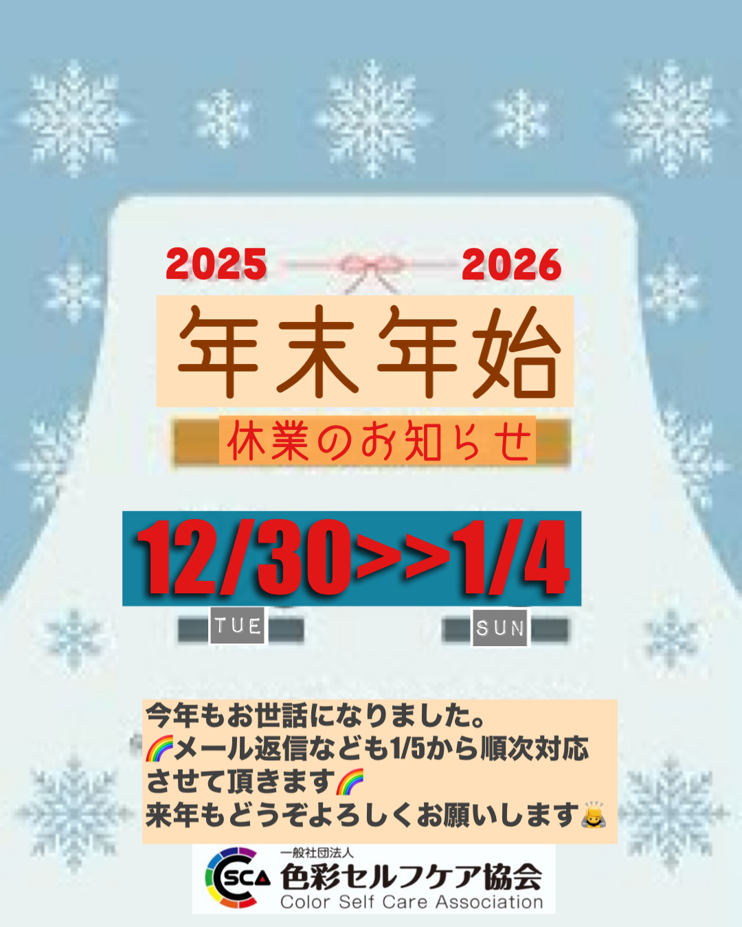 年末年始は12月30日(火)から1月4日(日)までを休業とさせていただき、メール返信などは5日から順次対応させていただきますので、どうぞご了承くださいませ。